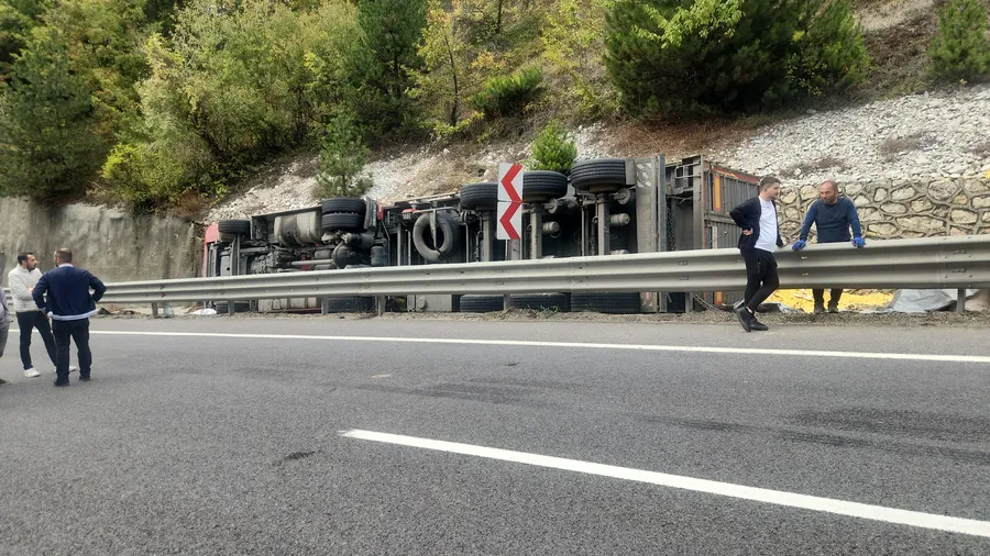Sabah saat 07.00 sıralarında Konya’dan Bursa istikametine seyir halindeyken sürücüsünün direksiyon hâkimiyetini kaybetmesi sonucu bariyerlere çarparak devrilen 42 ERG 17 plakalı tır, yol kenarına yan yatarak durabilmiş, kazada sürücü Ahmet S. (39) ile yolcu Saliha S. (33) ağır yaralanmıştı.