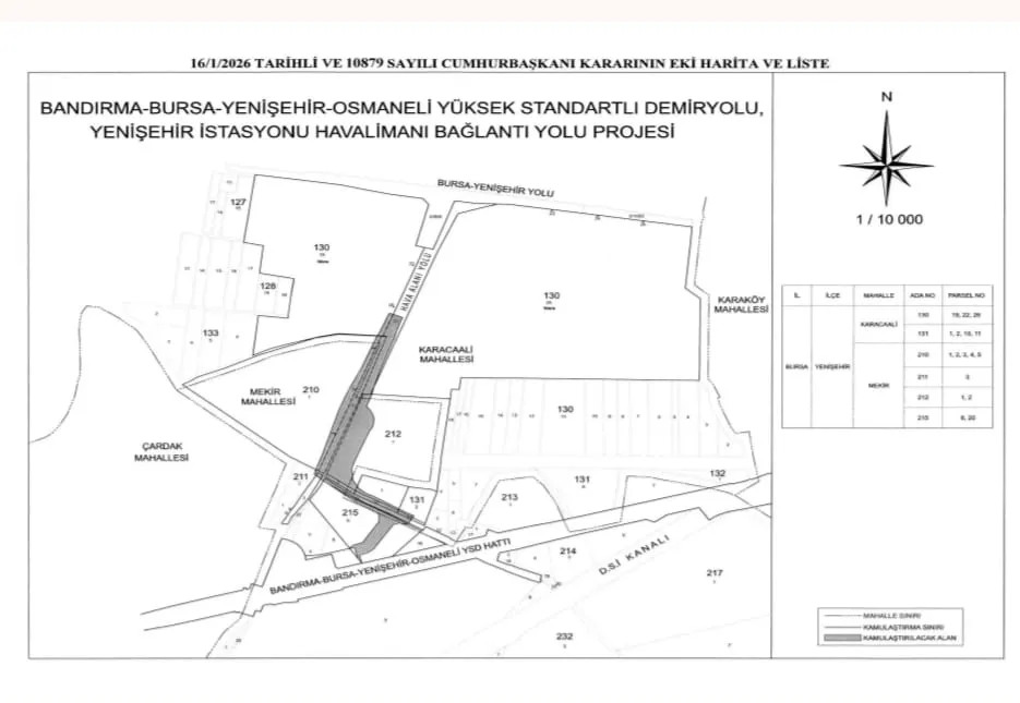 Resmî Gazete’de, 16 Ocak 2026 tarihli ve Cumhurbaşkanı Recep Tayyip Erdoğan imzasıyla yayımlanan kararda, Yenişehir İstasyonu’nun Yenişehir Havalimanı’na entegrasyonunun sağlanması amacıyla gerekli güzergâh üzerindeki taşınmazların acele kamulaştırılmasına hükmedildi.