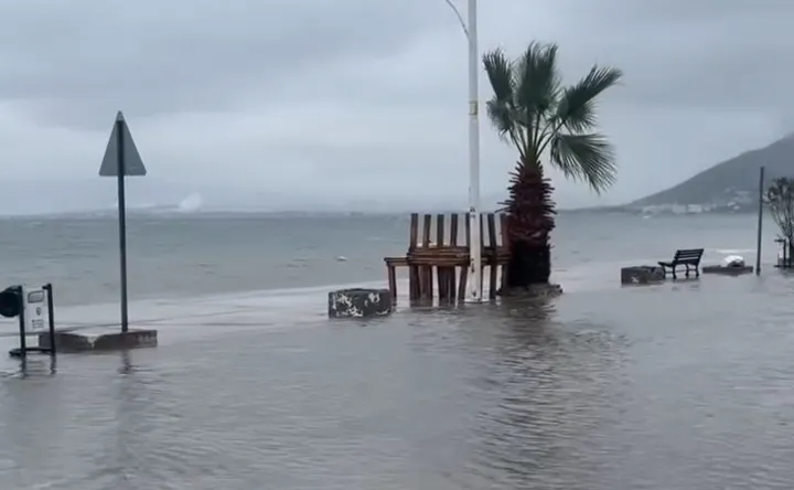 Fırtınanın etkisiyle oluşan taşkın anları dron ile havadan görüntülenirken, görüntülerde sahil yolunun büyük bölümünün suyla kaplandığı görüldü.