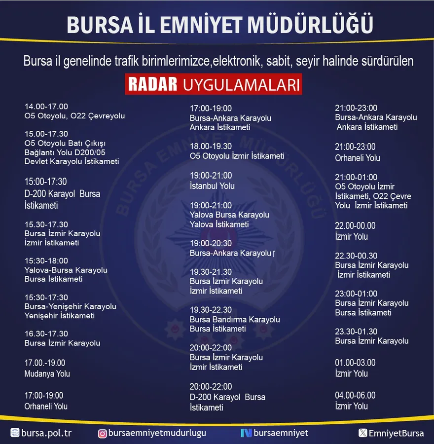 Açıklamaya göre denetimler, O-5 Otoyolu, O-22 Çevreyolu, Bursa-Ankara Karayolu, Bursa-İzmir Karayolu, D-200 Karayolu, Mudanya Yolu, Orhaneli Yolu, İstanbul Yolu ve Yalova-Bursa Karayolu başta olmak üzere ana arterlerde yapılacak.
