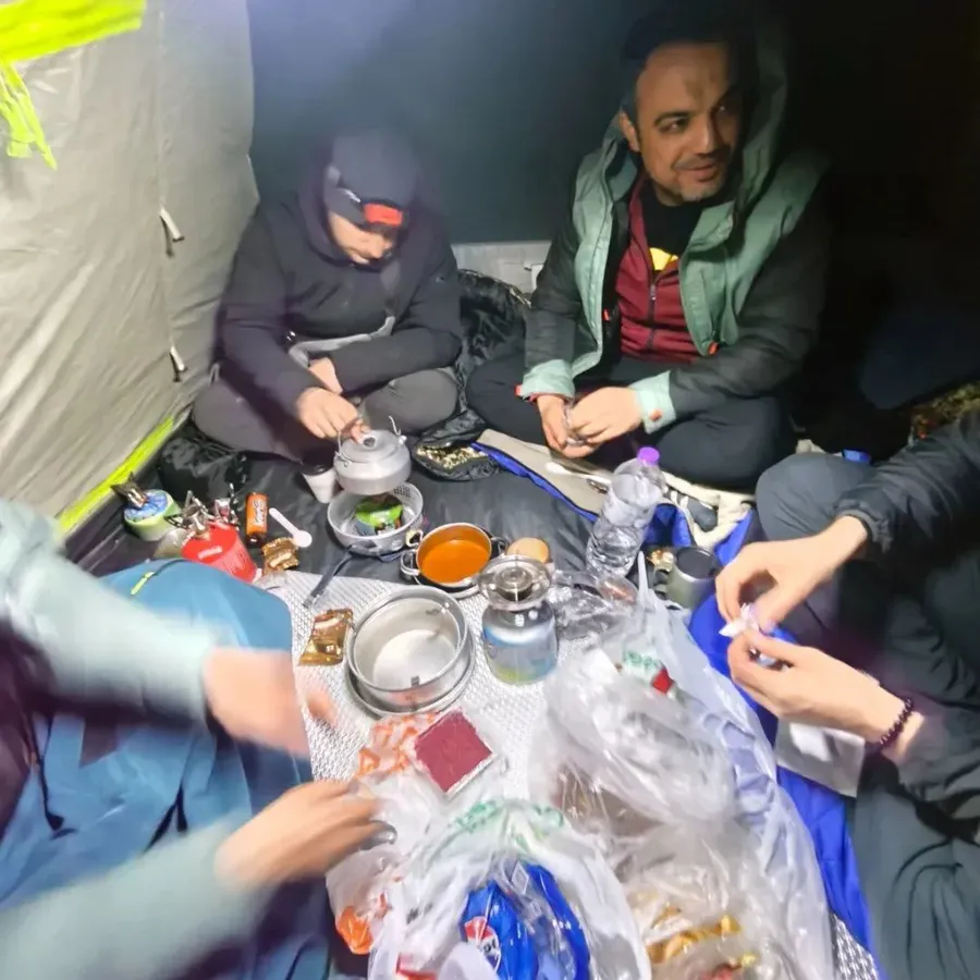 Kampın kurulmasının ardından ekip, akşam ezanında çadırlarda iftar yaptı. Gece saat 03.00’te zirve yürüyüşü başladı. Zirve altındaki çanak bölümde kar ve buz etabının aşılması için kramponlar takıldı; kazma ve baton desteğiyle doğu yüzünden dik rotada tırmanış gerçekleştirildi.
