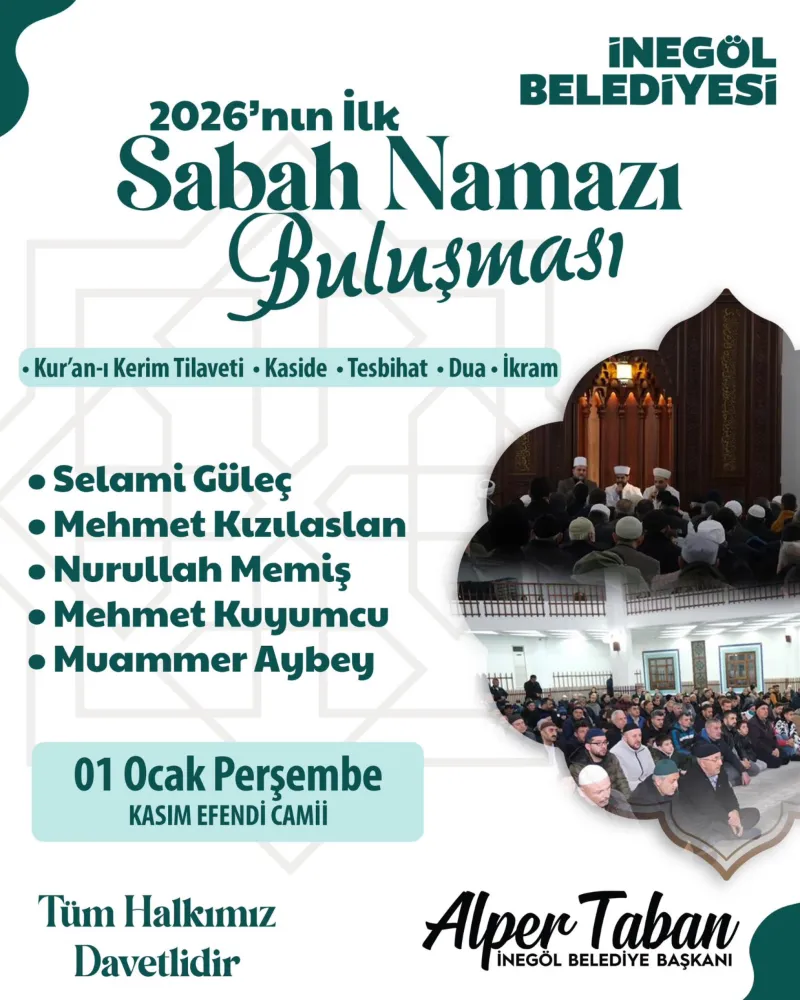 İnegöl Belediyesi, yeni yıla özel bir başlangıç için hazırlanıyor. 2026’nın ilk sabah namazında, 01 Ocak Perşembe günü Kasım Efendi Camisinde sabah namazı buluşması gerçekleştirilecek. Kuran-ı Kerim tilaveti, kasideler, tesbihat, dua ve ikramların yer alacağı sabah namazı buluşmasında; Selami Güleç, Mehmet Kızılaslan, Nurullah Memiş, Mehmet Kuyumcu ve Muammer Aybey gönülleri mest eden tilavetleri, kasideleri ve dualarıyla İnegöllülerle buluşacak.