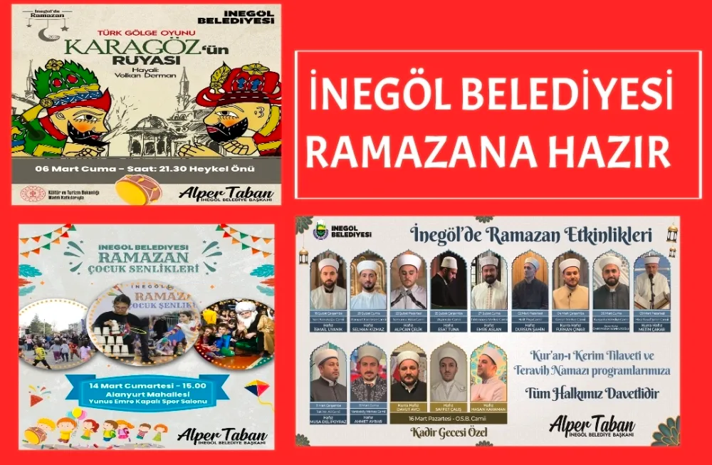 “Ramazan ayında bir önemli konumuz da Ramazan-ı Şerif’in ruhunu yansıtacak etkinlikler. Bu noktada Kültür ve Sosyal İşler Müdürlüğümüz ramazan ayında 12 farklı camide teravih programı ve 6 mahallemizde Mahalle Şenlikleri etkinlikleri ve 4 akşam heykel meydanımızda ramazan eğlenceleri gerçekleştirecek. Bu yıl da yine birbirinden kıymetli hafızlarımızı teravih programlarında farklı camilerimizde ilçe halkımızla buluşturacağız. Teravih programları kapsamında; 18 Şubat Çarşamba akşamı Hafız İsmail Uyanık hocamız Sani Konukoğlu Camisinde, 20 Şubat Cuma akşamı Hafız Selman Kızmaz Alanyurt Esentepe Camisinde, 23 Şubat Pazartesi Hafız Alpcan Çelik hocamız Somuncu Baba Camisinde, 25 Şubat Çarşamba Hafız Esat Tuna hocamız Urgancılar Camisinde, 27 Şubat Cuma Hafız Emre Aslan hocamız Tahtaköprü Merkez Camisinde, 02 Mart Pazartesi Hafız Dursun Şahin hocamız Halit Paşa Camisinde, 04 Mart Çarşamba Kurra Hafız Furkan Çınar hocamız Cerrah Merkez Camisinde, 06 Mart Cuma Kurra Hafız Ömer Faruk Mahmutoğlu hocamız Kurşunlu Belediye Camisinde, 09 Mart Pazartesi Kurra Hafız Metin Çakar hocamız Hacı Yusuf Şahin Camisinde, 11 Mart Çarşamba Hafız Musa Delipoyraz hocamız TOKİ Hz. Ali Camisinde, 13 Mart Cuma akşamı Hafız Ahmet Aybar hocamız Yeniceköy Merkez Camisinde vatandaşlarımızla buluşacak. 16 Mart Pazartesi gecesi idrak edeceğimiz Kadir Gecesinde ise Kurra Hafız Davut Avcı, Hafız Saffet Çalış ve Hafız Hasan Karaman hocalarımız OSB camisinde İnegöl halkımızla buluşacak.”