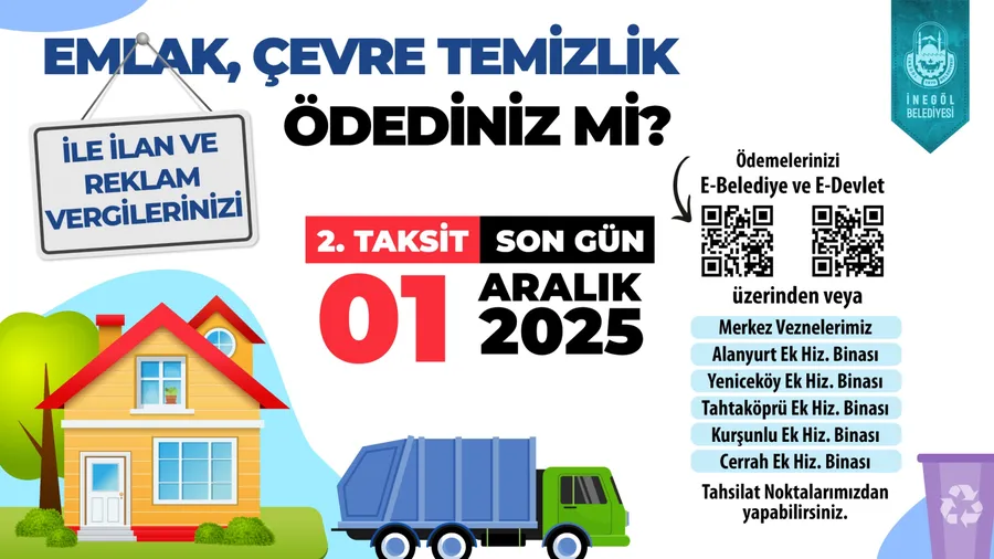 Belediyelerde 2025 yılı Emlak, Çevre Temizlik ve İlan Reklam vergilerinin ikinci taksit ödeme yoğunluğu devam ediyor. İnegöl