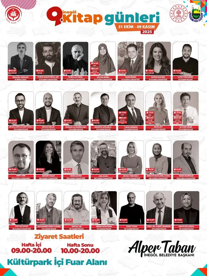 “İnegöl’ün artık önemli bir kazanımı da var, yerel yazarlarımız. Yerel yazarlarımız 9 fuar süresince istikrarlı şekilde artmaya devam etti. 46 yerel yazarımız da bu fuarda eserlerini sunacaklar. Aynı zamanda diğer yazarlarımızın da imza ve söyleşi günleri olacak. 2025 yılı Aile Yılı olması hasebiyle de aile temalı söyleşilere ağırlık verdiğimiz bir planlama yaptık. 1 Kasım Cumartesi günü Saliha Erdim, 2 Kasım Pazar günü de Tufan Gündüz, Pelin Çift ve Ali Faik Demir söyleşi programları Beşinci Mevsim Kültür Sanat Merkezimizde olacak. Yine fuar kapsamında İnegöl’ümüze gelecek 16 yazarımız, 16 farklı okulumuzda öğrencilerimizle buluşarak imza ve söyleşi programı gerçekleştirecek. Bu okullarımıza da İnegöl Belediyesi olarak 3.200 adet kitap hediye ettik.”