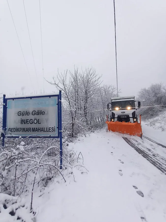 İnegöl’de bayramın ilk gününde etkili olan kar yağışı, kırsal mahalle yollarını ulaşıma kapattı. Bursa Büyükşehir Belediyesi ekiplerinin çalışmalarıyla yollar yeniden açılarak ulaşım normale döndürüldü.