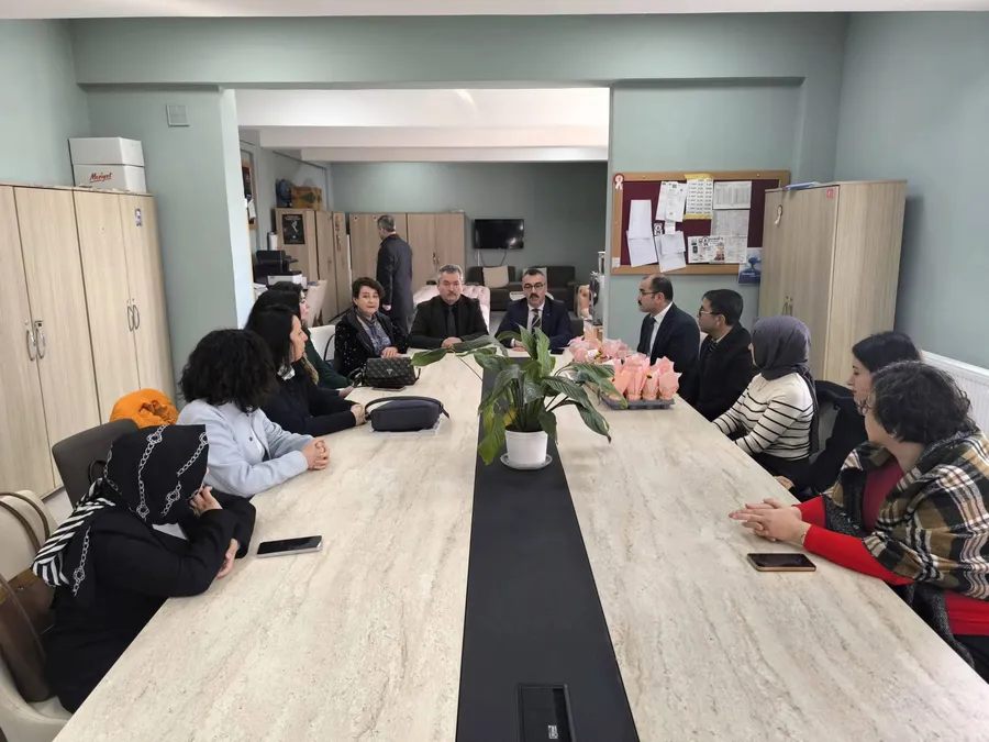 Ziyaret kapsamında okulda görev yapan öğretmenlerle sohbet eden protokol üyeleri, 8 Mart Dünya Kadınlar Günü dolayısıyla kadın öğretmenlerin gününü kutladı.