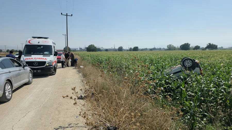 16 AFE 491 plakalı hafif ticari araç, sürücüsü Servet A. (47)’nın direksiyon hâkimiyetini kaybetmesi sonucu virajda yoldan çıkarak mısır tarlasına yuvarlandı. Takla atan araç ters dönerek durabildi.