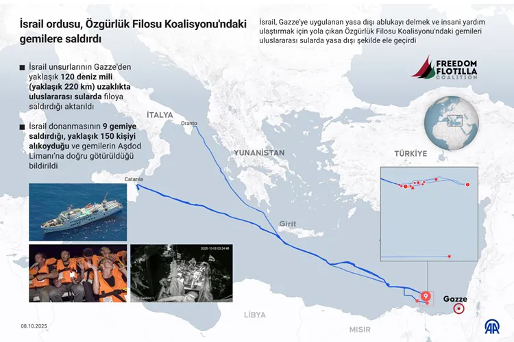 Açıklamada, gemilerin yasa dışı şekilde durdurulduğu ve filodaki gemilerin Gazze’deki kritik ihtiyaç içindeki hastanelere gönderilmek üzere 110 bin dolar değerinde ilaç, solunum cihazı ve besin malzemesi taşıdığı ifade edildi.