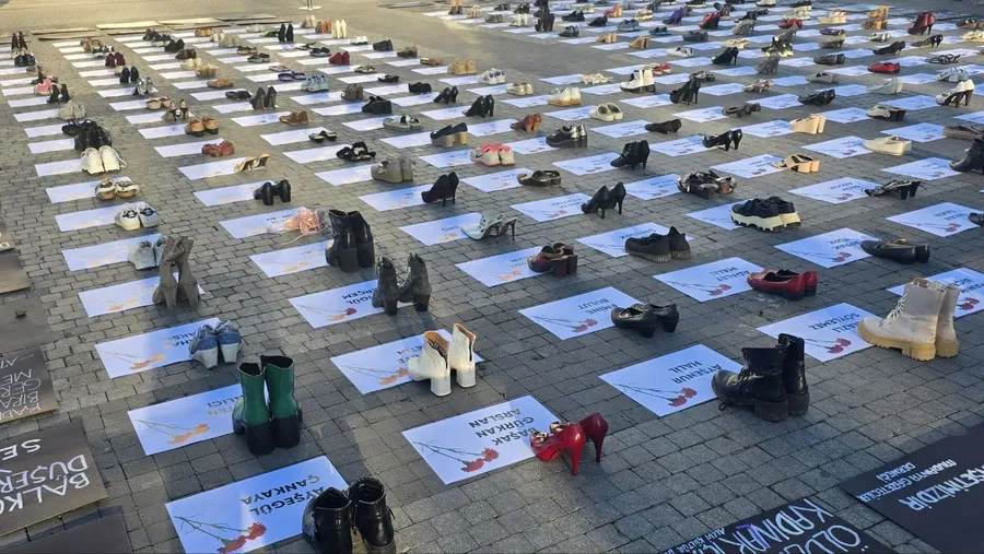 Meydan’a ulaşıldığında, şiddet nedeniyle yaşamını yitiren kadınları temsilen yere bırakılan yüzlerce ayakkabının etrafında çember oluşturuldu ve bir dakikalık saygı duruşunda bulunuldu. Ardından gerçekleştirilen kısa süreli çığlık eylemi ile farkındalık artırıldı.