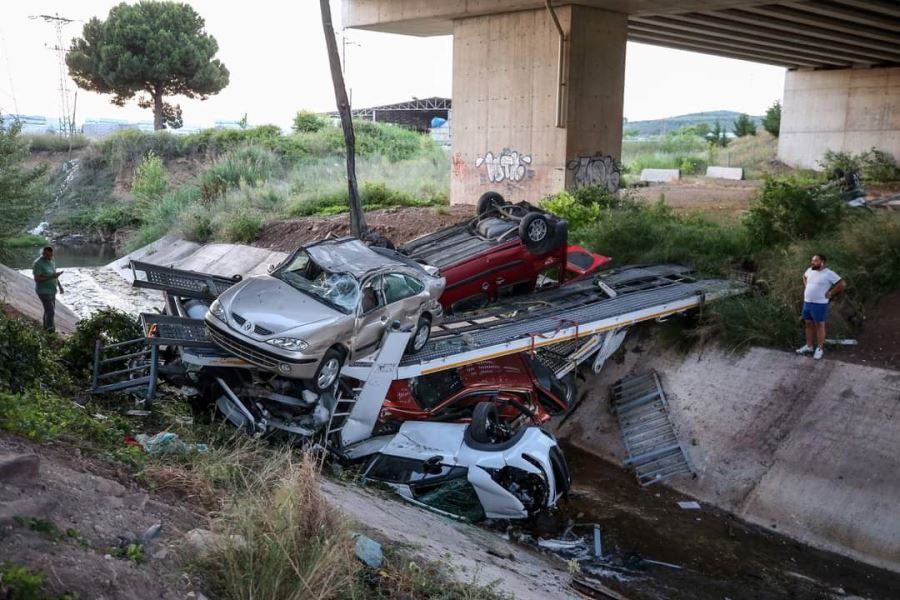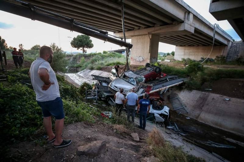 Çarpmanın etkisiyle bariyerleri aşan tır, yaklaşık 15 metre yükseklikteki viyadükten sulama kanalına düştü.