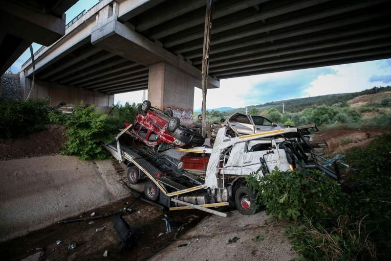 Bursa'da otomobil taşıyan tırın viyadükten düşmesi sonucu 1 kişi yaralandı.