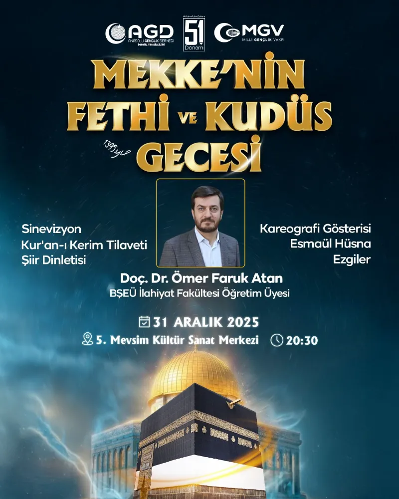 İslam tarihinin iki önemli sembolü olan Mekke ve Kudüs’ün fethini ve bu fetihlerin taşıdığı manevi anlamı gençlerle ve vatandaşlarla buluşturmayı amaçlayan programda; Kur’an-ı Kerim tilaveti, sinevizyon gösterimi, şiir dinletileri, Esmaü’l Hüsna, ezgiler ve koreografi gösterileri yer alacak.