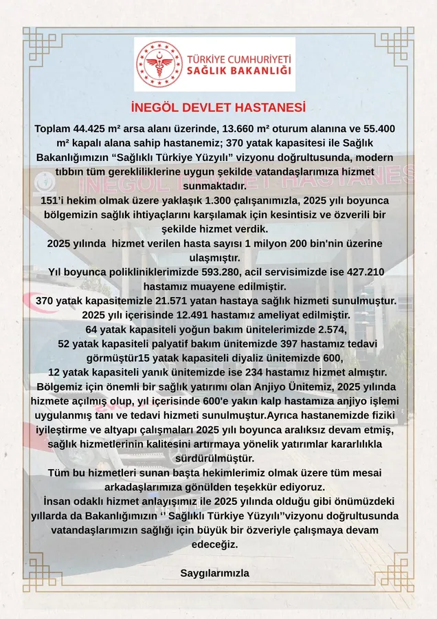 Yazılı açıklama yapan Başhekim Sarı, hastanenin fiziki kapasitesi ve personel yapısına ilişkin bilgi vererek, “Toplam 44 bin 425 metrekare arsa alanı üzerinde, 13 bin 660 metrekare oturum alanına ve 55 bin 400 metrekare kapalı alana sahip hastanemiz; 370 yatak kapasitesiyle Sağlık Bakanlığımızın ‘Sağlıklı Türkiye Yüzyılı’ vizyonu doğrultusunda, modern tıbbın tüm gerekliliklerine uygun şekilde vatandaşlarımıza hizmet sunmaktadır. 151’i hekim olmak üzere yaklaşık bin 300 çalışanımızla 2025 yılı boyunca bölgemizin sağlık ihtiyaçlarını karşılamak için kesintisiz ve özverili bir şekilde çalıştık” ifadelerini kullandı.