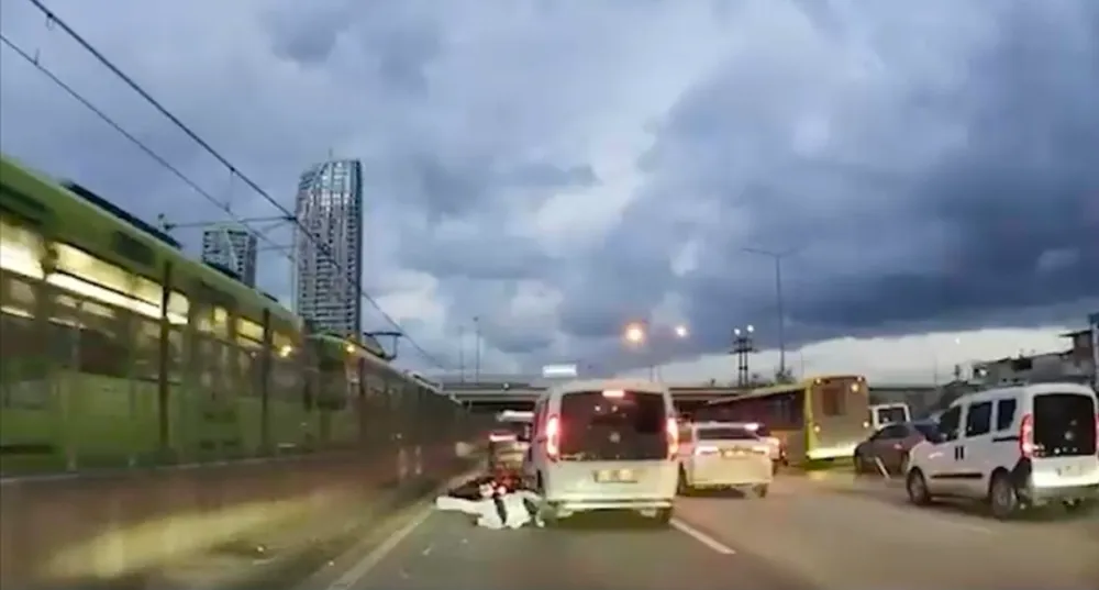 Motosiklet sürücüsünün hafif yaralandığı kaza, arkadan gelen başka bir aracın kamerasınca kaydedildi.