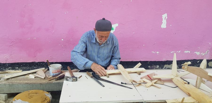 “Kuru kavaktan yapıyorum. Burada oturup keserle bu hale getiriyorum. Sonra baya alıyorum ve boyuyorum. Bayrak da yapıp ismimi yazıyorum bu hale getiriyorum. Çocuklara veriyorum. Geliyorlar bayramda, uçaklara bakıyorlar bende, ‘Al sana uçak’ diyorum veriyorum. Şehirlere de veriyorum. Domaniç, Eskişehir, Isparta, Muş gibi şehirlere de verdim”