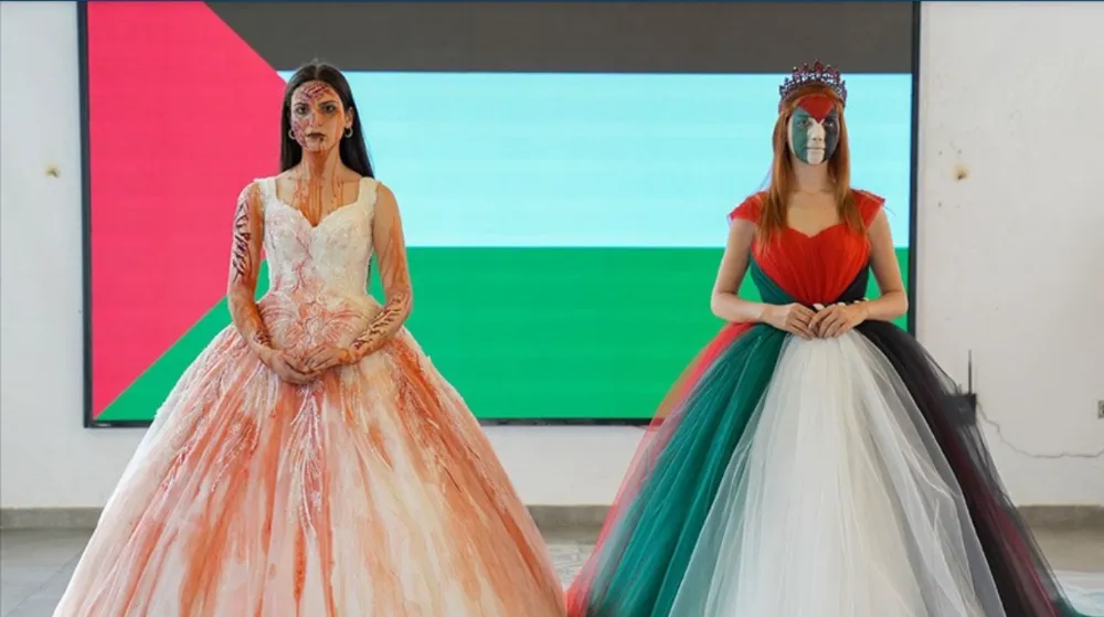 Firmanın ilk büyük organizasyonda podyumda, İsrail'i protesto için hazırlanan Filistin bayrağı renklerindeki kıyafet ve kanlı gelinlik, aynı renklerde yüz makyajı yapılan mankenlerce tanıtıldı.
